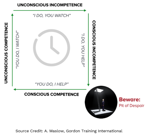 Here the expert needs to express more support and assistance so that the learner doesn’t fall into the “Pit of Despair.” As the expert, it can be easy to think they should have mastered it by now, however it’s not yet second nature. It takes time, which is why there is a clock in the middle of the diagram above. What they really need is not just more time but vision, and encouragement from you to get to the final stage.